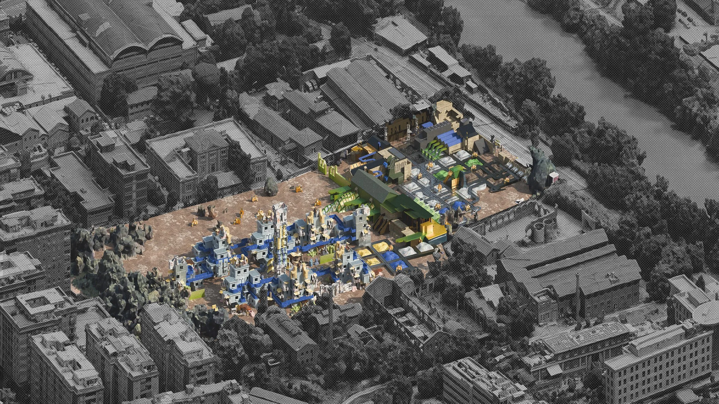Palimpsest of Waste This project reimagines synthetic waste as both material and social infrastructure, exploring its agency in shaping alternative architecture, community, and reuse. Next to the former Mira Lanza soap factory in Rome - once a site of industrial reuse and now home to informal shelters - it proposes a circular system where plastic waste is collected, processed, and cast into new architectural elements. Rather than displacing current residents, it integrates their resourceful reuse practices into dignified, adaptable housing built from collected waste. Cast fragments - furniture to landscapes - draw from found objects, reflecting personal needs and memories. At its core is a plastic piazza with open kitchens and markets, echoing Roman social traditions. Anchored by a waste campanile, this shared space fosters gathering and exchange. Waste becomes more than material - it is a medium of connection and memory, forming a living archive of care and coexistence.